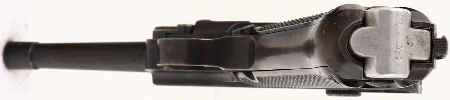 Mauser, Model: P08 Luger, Cal: 9x19mm, MFG: 1940, S/N: 3661, Semi-auto pistol, 4'' barrel. The checkered, black plastic grips are excellent with little to no wear. The blued metal finish rates 75% with areas of cleaned pitting, brown patina, & spots worn to gun metal gray. The left side of the upper assembly is marked with the S/N. the top of the upper assembly is marked ''1940''. The right side of the upper assembly is marked with three Waffenamt' s, the middle & far right stamp have are faded from wear. Front of the frame is marked with the S/N, & the S/N block letter ''m''. The right side of the barrel is marked with a iron eagle proof stamp. The bottom of the barrel is marked with the S/N, & ''8.81''. The top of the toggle is marked with the Mauser code ''42'' & the last two digits of the S/N. all visible serialized parts on the pistol are S/N matched. The bore is good. Its bright with roughness & thinned rifling. The barrel holds a barleycorn front sight with a V-notch rear sight. Pistol comes with one aluminum mag that's marked on the base ''3001'', ''t'', ''+'', & one Waffenamt proof stamp. FFL or C&R Req. - Value: 700 to 2000