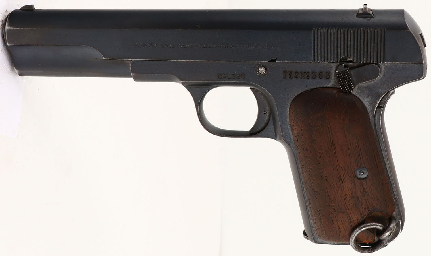 Husqvarna Vapenfabrik (Swedish), Model: M1907, Cal: .380 ACP, MFG: 1930's-40, S/N: 7263, Semi-auto pistol, 5'' barrel.