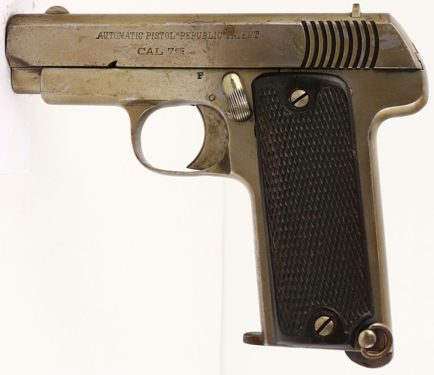 CONDITION: The checkered wood grips are very good. They have darkened from oils & age. Grips also have light wear & a few small chips. The metal was left in the white & has a added on lacquer finish. The left side of the slide is marked ''AUTOMATIC PISTOL''REPUBLIC''PATENT'', ''CAL 7.65''. The right side of the frame is marked with the S/N. the bottom of the pistol grip is marked ''MADE IN SPAIN''. The bore is very good. Its bright with roughness. The slide holds a blade front sight with a V-notch rear sight. Pistol comes with one mag that's marked ''AK'' in a circle. FFL or C&R Req. - Value: 200 to 400
