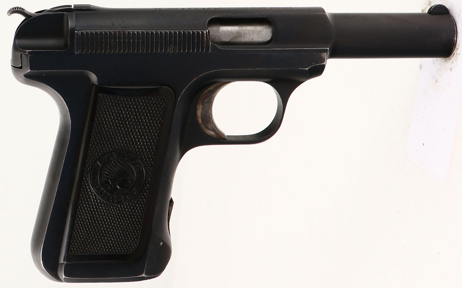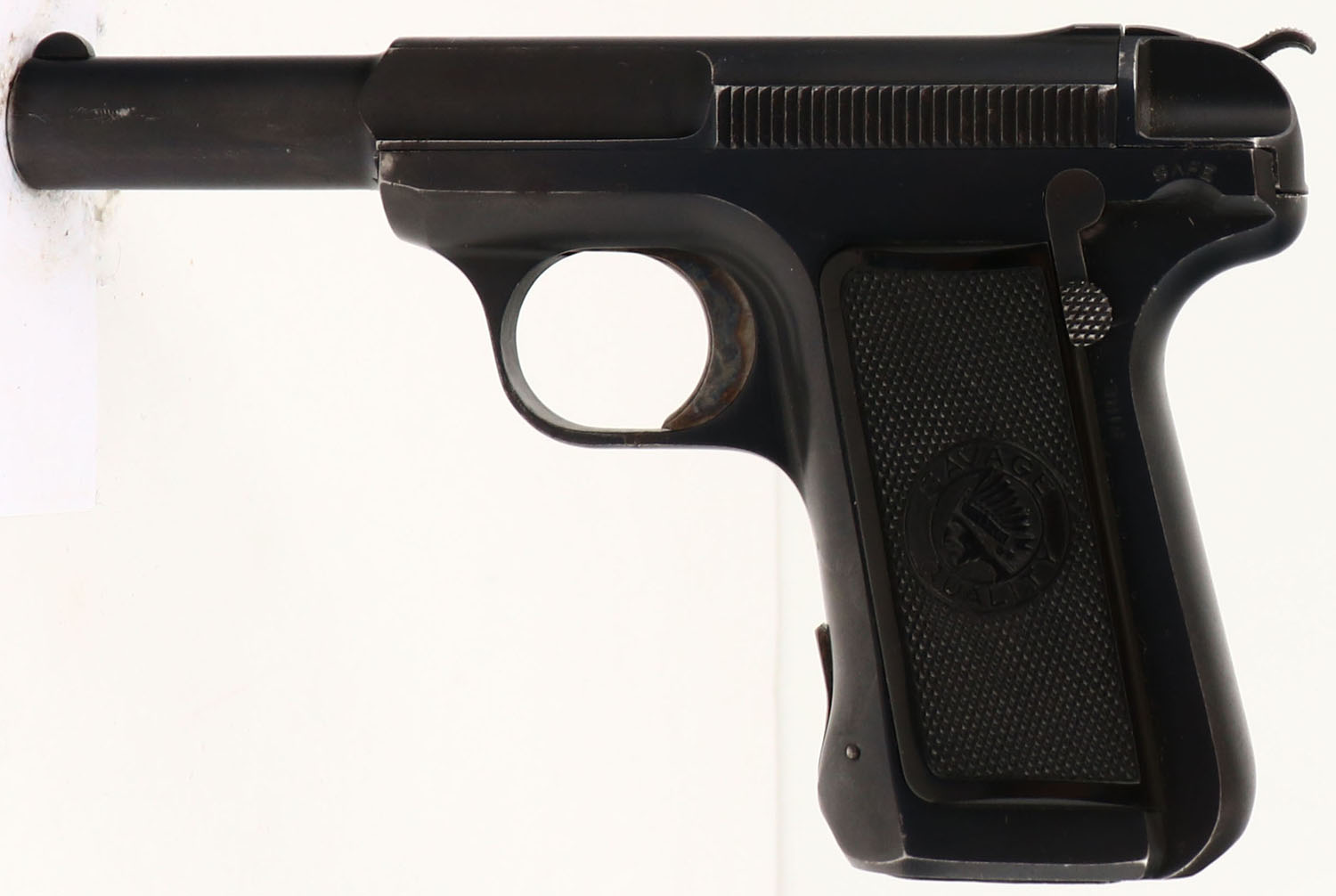 Savage, Model 1907, CAL: 32 ACP, MFG: 1919, SN: 222029, 3 3/4'' barrel. Although history indicates production began in 1907, real production didn't truly begin until 1908. Advertised with the slogan ''Ten shots quick!'', the Model 1907 was very popular because, despite its small size, it had a 10-round double-stack magazine. The checkered gutta-percha grips are excellent & feature a Savage Indian profile logo. There are minor scratches & scrapes. This is a later variation pistol, with the more narrow serrations on slide & the flatter blued finish. The metal blue finish rates 95% overall, with holster wear & spotting, toned to a brown patina. The case-hardened trigger displays excellent case-colors. Bore is good, consistently rough, with intermittent pitting amongst strong rifling. Integral notch rear sight & blade front sight. A nice example of a late production 1907. FFL or C&R Req. - Value: 400 to 750