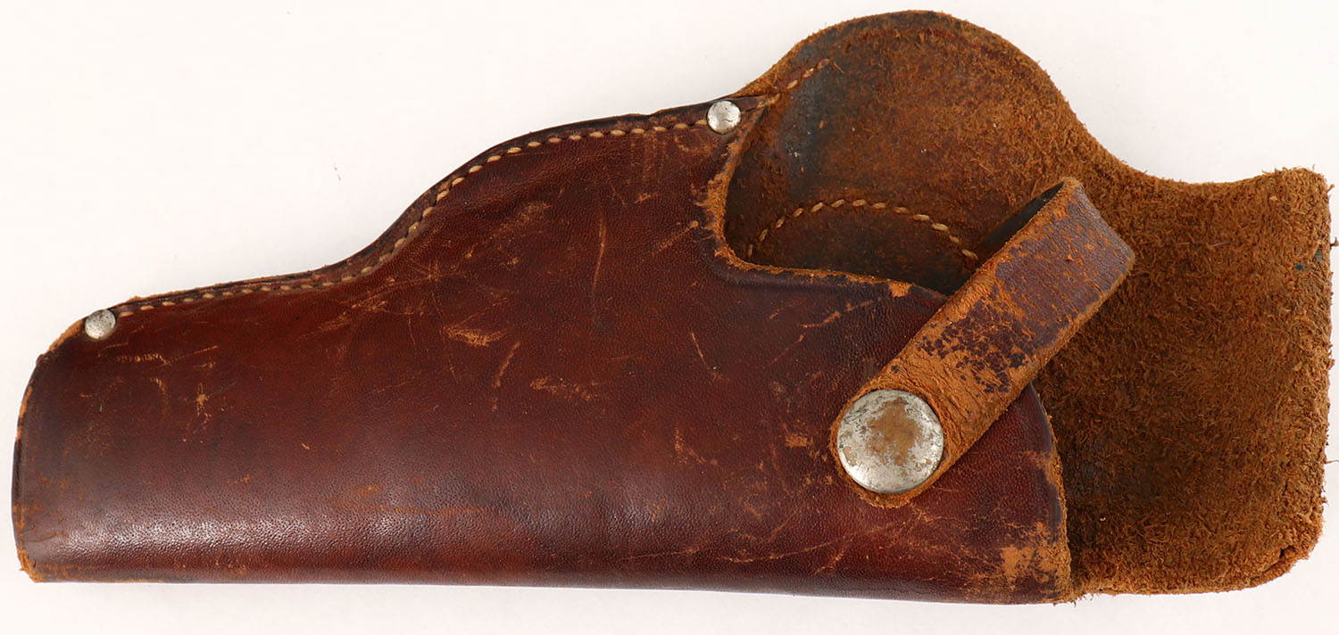 Savage, Model 1907, CAL: .32, MFG: 1914, SN: 101458, Semi Auto Pistol, 3 3/4'' barrel. The Savage logo checkered plastic grips are very good & solid. There is a small crack on the left grip, along with other contusions, scrapes & minor dings. This is the earlier varitation with the wider serrations & the high polish blued finish. The metal blue finish rates 30% on the barrel & 50% on the frame. Bore is very good & bright, with consistent light speckling throughout. Integral rear sight & blade front sight. The trigger pulls back, but the hammer does not drop. There is an unknown internal parts issue. Comes with an unmarked leather holster. FFL or C&R Req. - Value: 100 to 200