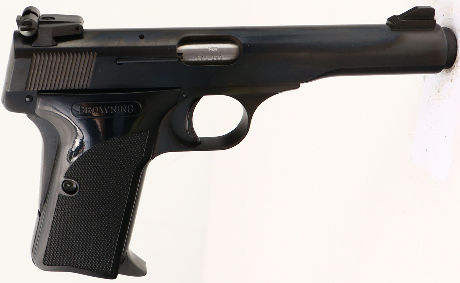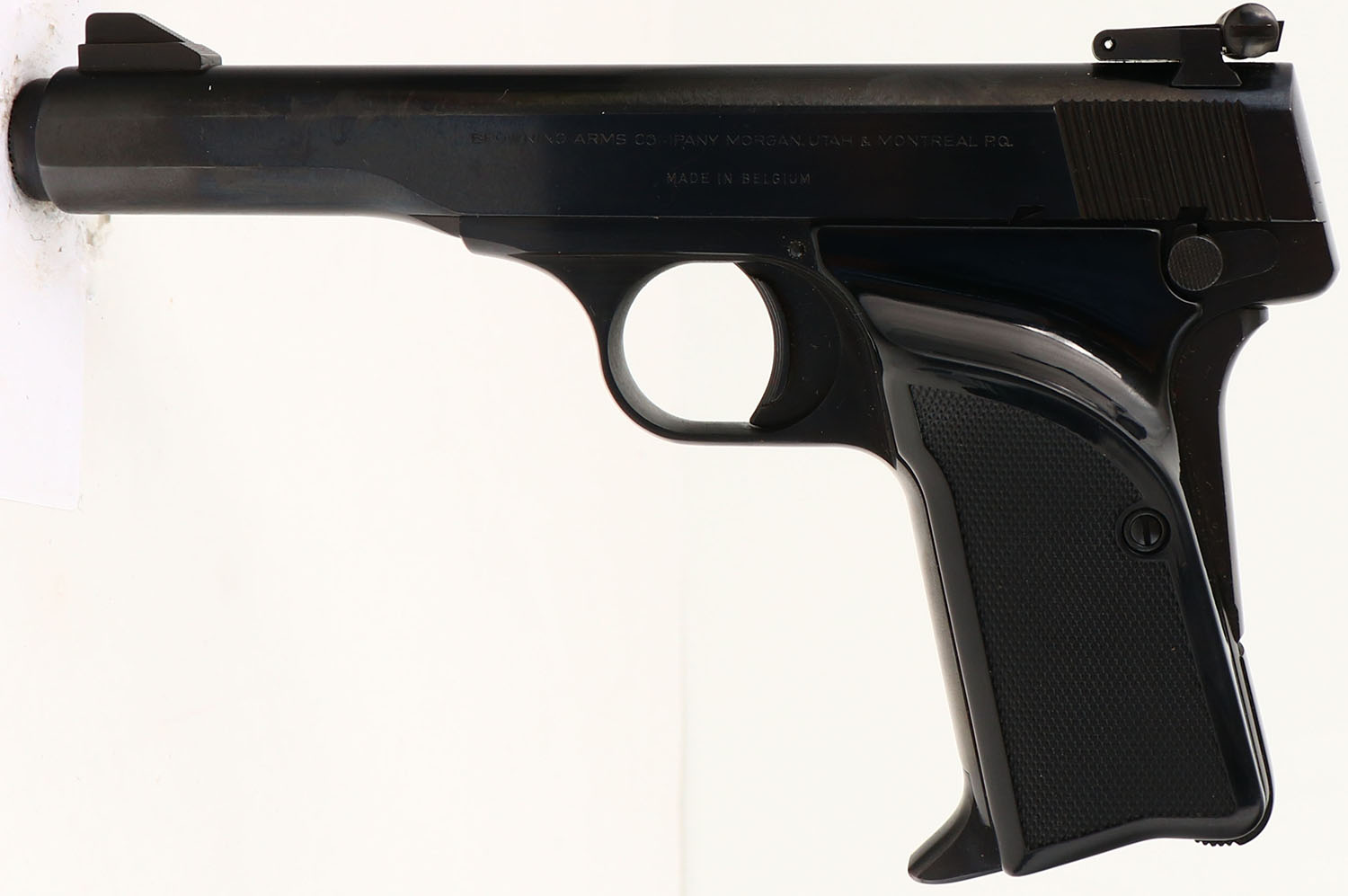 FN Browning, Model 10/71, CAL: .380, MFG: 1972, SN: 72N22797, Semi Auto Pistol, 4 3/8'' barrel. The original Browning checkered plastic grips are excellent. The original metal blue finish rates 99%+ overall. Bore is near mint. Factory adjustable rear sight & elevated serrated blade front sight. Comes with original pouch with red interior & instruction manual. A very high condition example of a Model 10/71. FFL or C&R Req - Value: 600 to 900