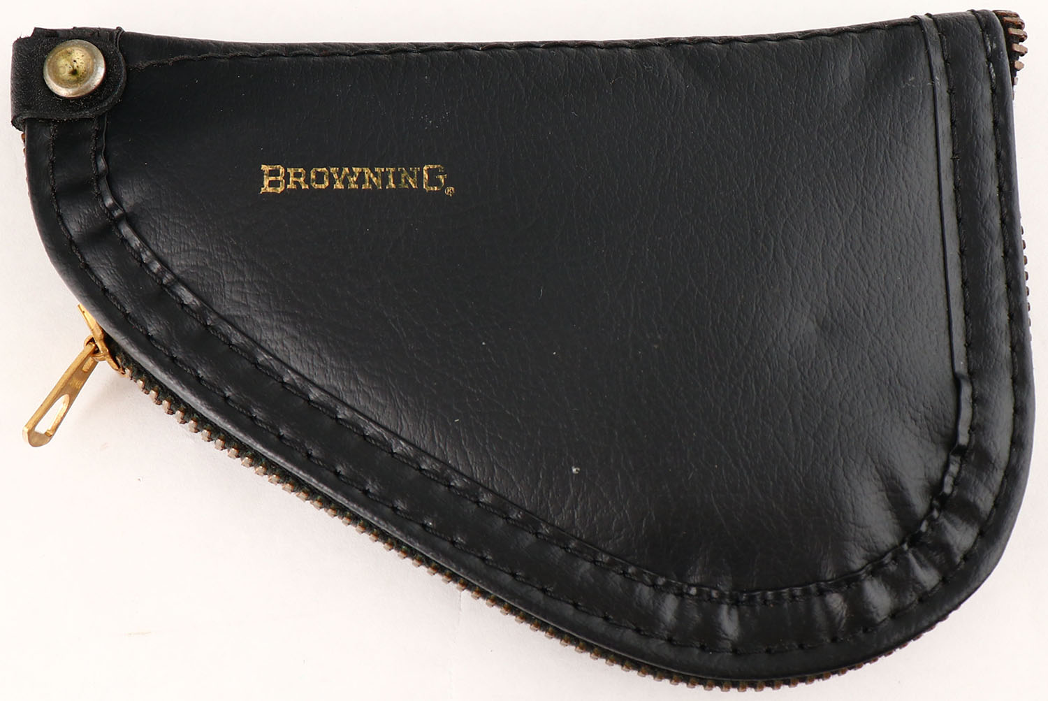 Browning (FN), ''Baby'' Model, CAL: 25 ACP (6.35mm), MFG: 1968, SN: 453934, Semi Auto Pistol, 2'' barrel. The Browning marked checkered plastic grips are excellent. The original metal blue finish rates 98% overall. Bore is excellent. Factory notch & blade sights. Comes in original Browning pouch, with red interior. Pouch condition is excellent. FFL or C&R Req. - Value: 450 to 750