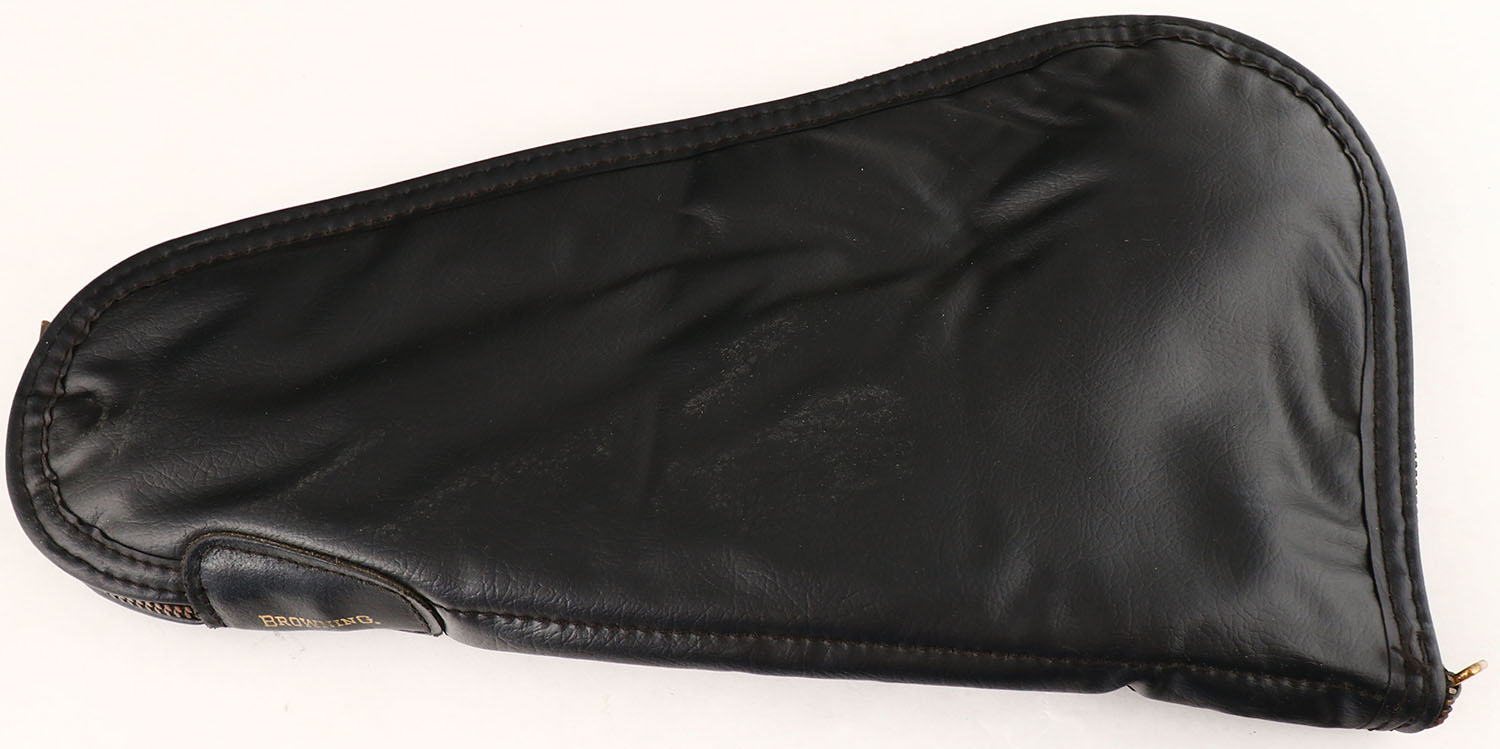 CASED, Browning, Nomad, CAL: 22LR, MFG: 1969, SN: 2750P69, Semi Auto Pistol, 6 3/4'' barrel. The Browning checkered plastic grips are excellent. There are minor scuffs & scrapes. The original metal blue finish rates 97%, with a small area of spotting on the left side of the barrel. Bore is excellent. Adjustable rear sight & ramp elevated serrated blade front sight. Browning factory mag. Comes in original Browning pouch with red interior. FFL or C&R Req. - Value: 400 to 600