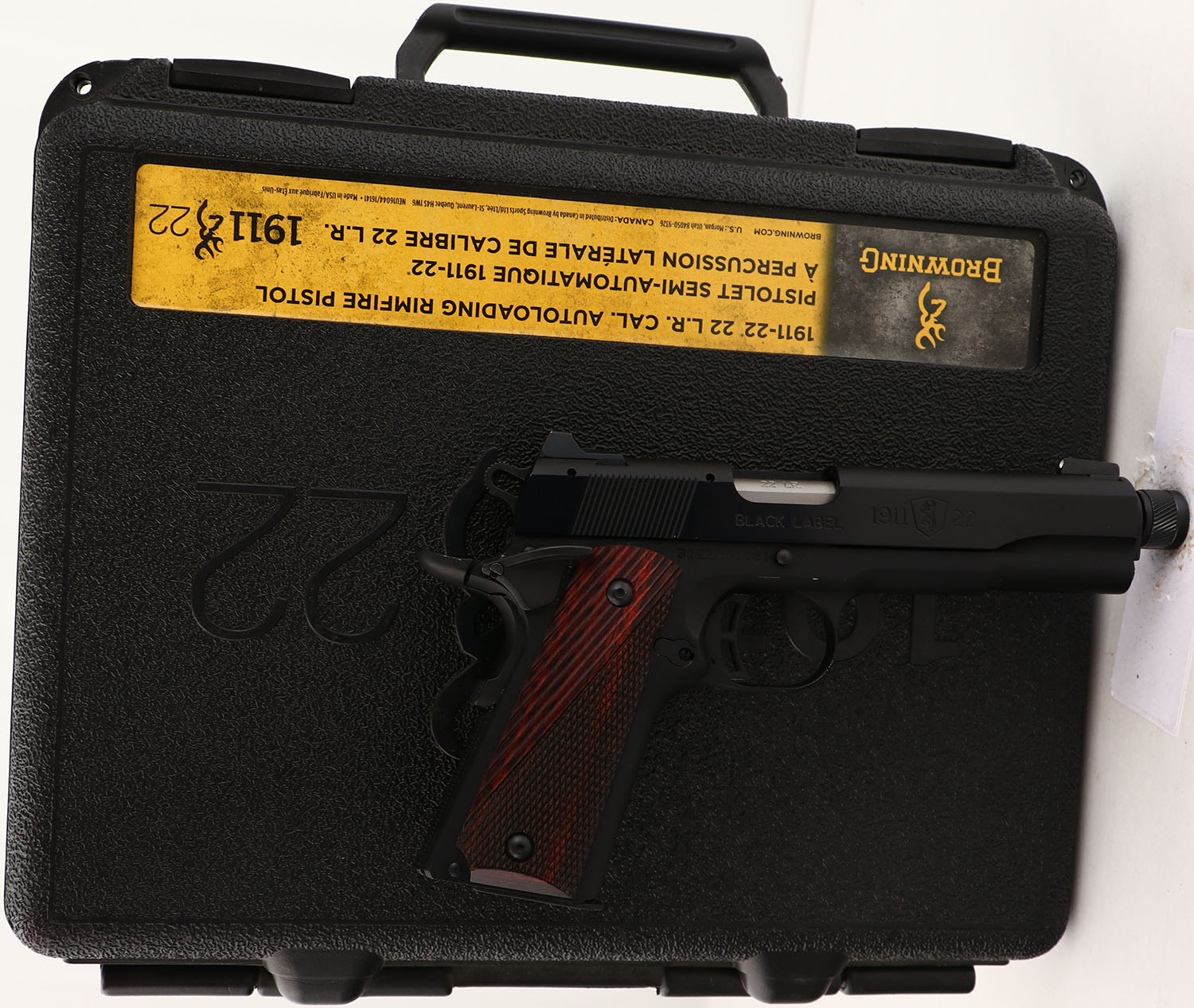 CASED, Browning, 1911/22 Black Label, CAL: .22LR, MFG: Modern, SN: 51EZR01681, Semi Auto Pistol, 4 3/4'' barrel. The checkered wood grips are excellent. The two-tone matte black finish rates 99% overall. Bore is excellent. Factory contrast sights. Threaded barrel. Comes in factory hard case, with test fire cartridge, lock/key. FFL Req. - Value: 400 to 700