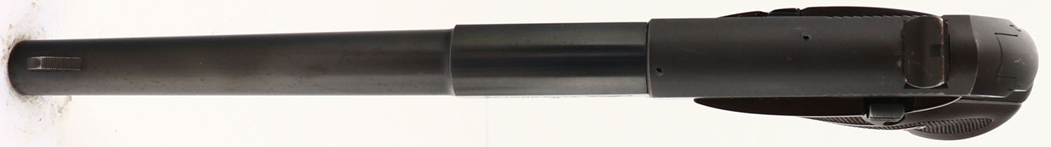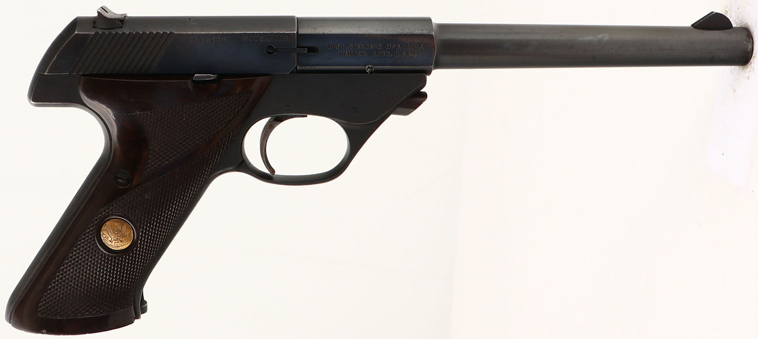 High Standard, Model 103 Sport King, CAL: 22LR, MFG: 1964, SN: 1381835, Semi Auto Pistol, 6 3/4'' barrel. The HS logo medallion checkered plastic grips are very good & solid. There are a few small edge chips on the bottom of the grips, along with minor scuffs & scrapes. The metal blue finish rates 90%, with spotting. Bore is excellent. Fixed rear sight & serrated blade front sight. High Standard factory mag. FFL or C&R Req. - Value: 150 to 300