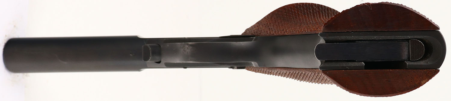 High Standard, The Sharpshooter, CAL: .22LR, MFG: 1948, SN: 2492761, Semi Auto Pistol, 5 1/2'' bull barrel. The checkered wood grips are excellent, with only a couple minor dings. The metal blue finish rates 90% on the barrel, with holster wear & the matte finish on the frame rates 95%. Bore is excellent. Adjustable large rear sight & ramp elevated serrated blade front sight. FFL or C&R Req. - Value: 300 to 450