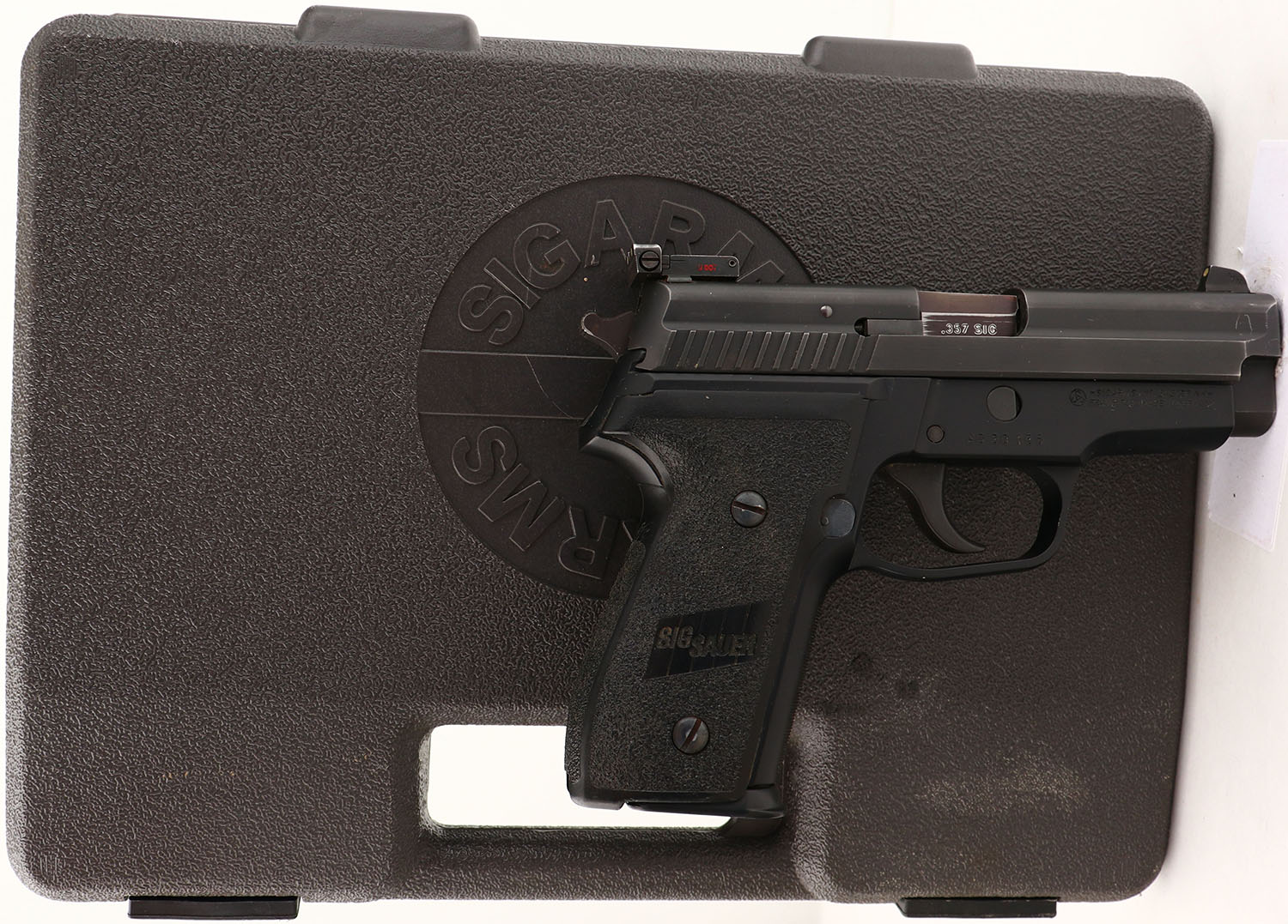 CASED, Sig Sauer, Model P229, CAL: .357 SIG, MFG: Modern, SN: AD30155, Semi Auto Pistol, 3 3/4'' barrel. The textured polymer grips are excellent. There is light overall wear from use. The metal blue finish rates 95% overall, with some light scratches & scrapes. Bore is excellent. Upgraded MH3 night sights. Comes in factory hard case, with related paperwork, extra mag & original hang tag. FFL Req. - Value: 400 to 650
