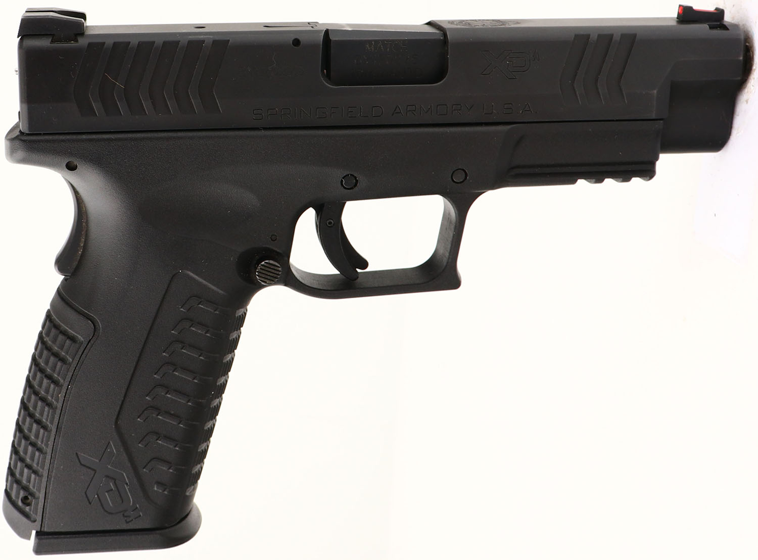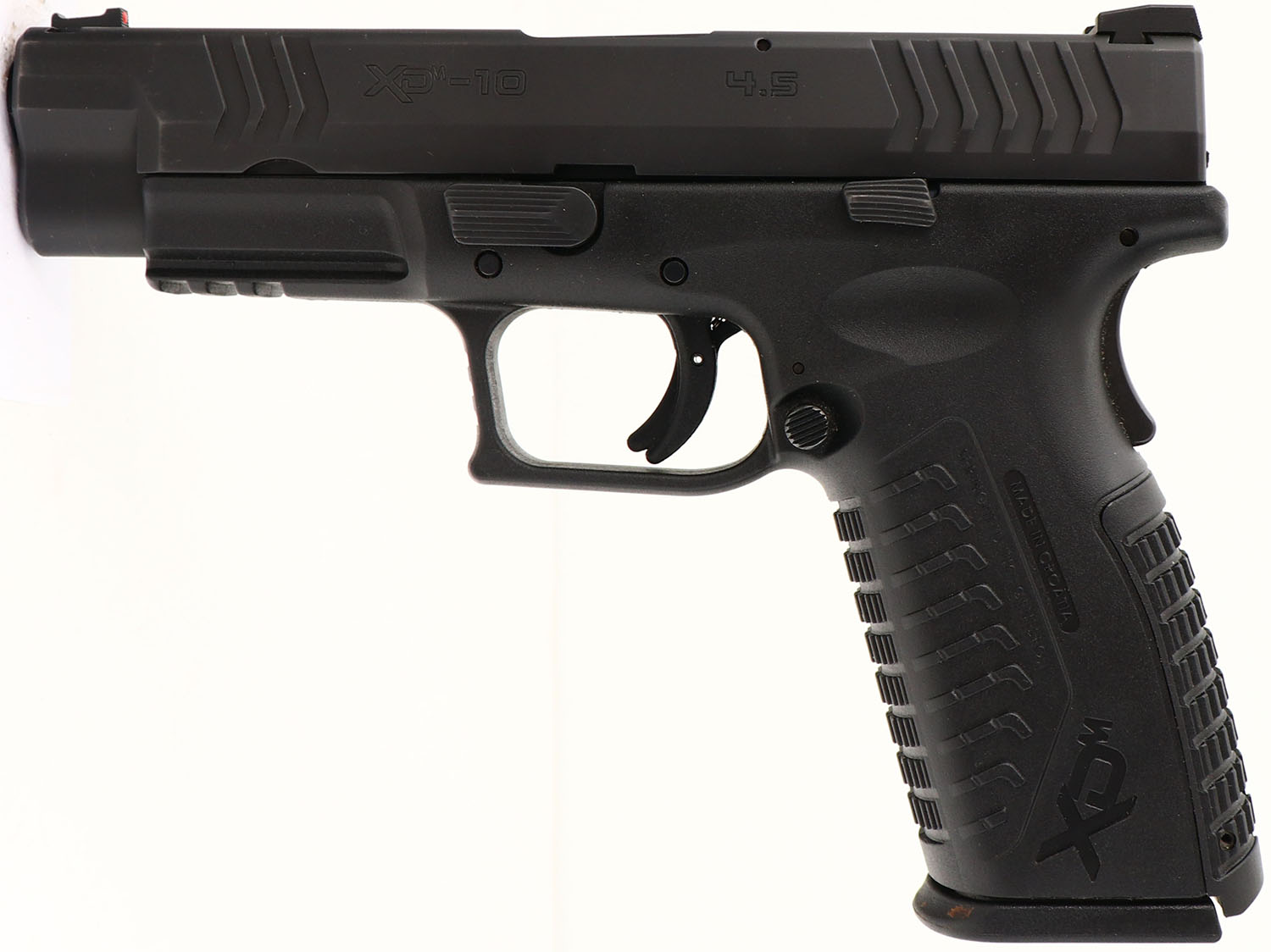 Springfield Armory, XDM-10 4.5, CAL: 10mm AUTO, MFG: Modern, SN: BY170275, Semi Auto Pistol, 4 1/2'' barrel. The factory textured polymer grip frame is excellent. The matte black finish on the slide rates 99%. Bore is excellent. White two-dot rear sight & red fiber optic rail front sight. FFL Req. - Value: 400 to 600