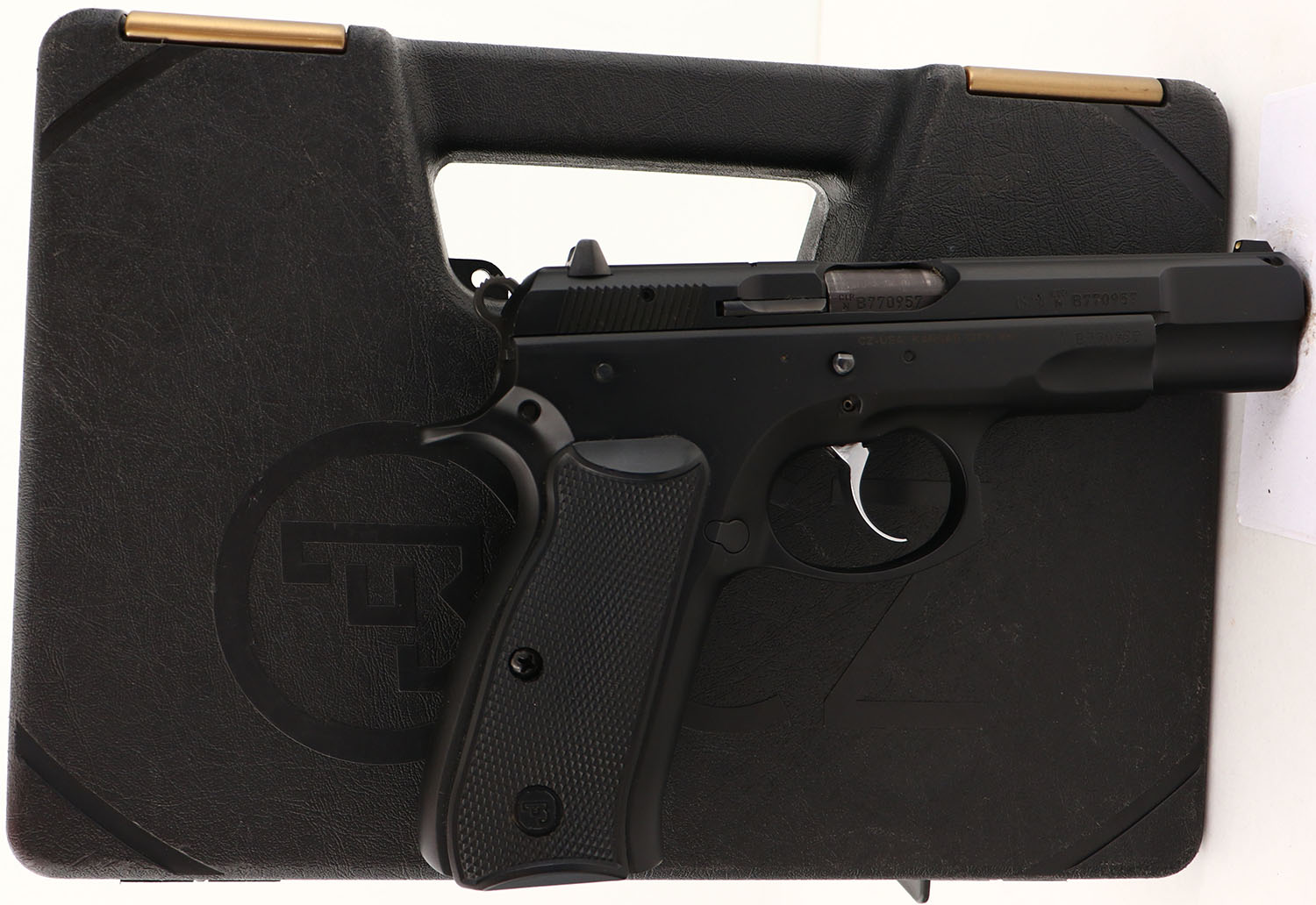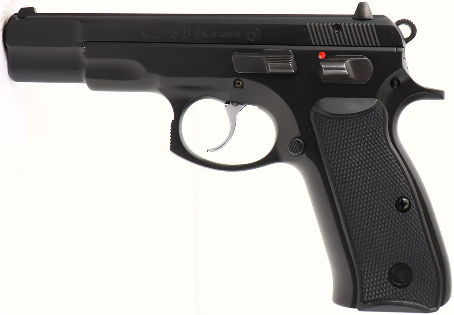 CASED, CZ, Model 75B, CAL: 9mm, MFG: Modern, SN: B770957, Semi Auto Pistol, 4 1/2'' barrel. The CZ marked checkered plastic grips are excellent. The matte black finish on the frame & slide rates 99% overall. Bore is excellent. Factory contrast sights. Comes in factory hard case, with related paperwork & cleaning brushes. Consignor noted that firing pin is missing. MSRP: $649.00 FFL Req. - Value: 400 to 600