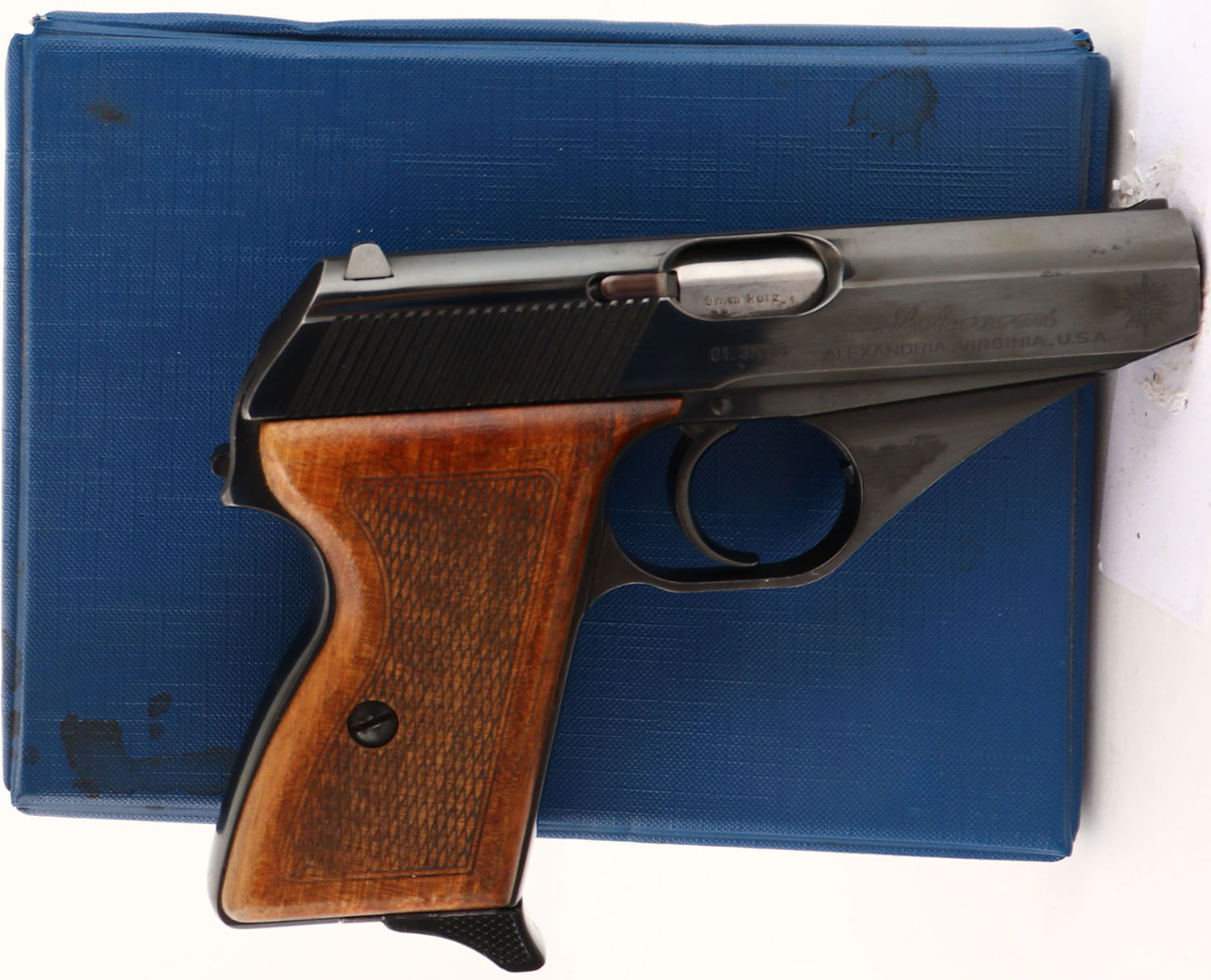 BOXED, Mauser, HSc, CAL: 9mm Kurz (.380 Auto), MFG: 1940-77, SN: 01.37228, Semi Auto Pistol, 3 1/4'' barrel. The checkered wood grips are excellent. The original metal blue finish rates 98% overall. Bore is excellent. Factory fixed sights. Comes in original box with related paperwork. Box condition is very good, with staining on the lid & bottom. FFL Req. - Value: 350 to 550
