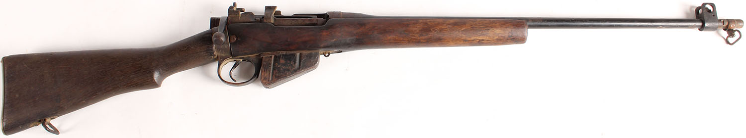 ROF Maltby, Model: No.4 MK.1, Cal: .303 British, MFG: 1944, S/N: 17044, Bolt action rifle, 25 1.4'' barrel. The semi-pistol grip wood stock is good as being cut down, sanded & oiled. The stock has a few hairline cracks around the wrist band. No visible markings on the stock. The metal finish on the barrel has mostly worn away with areas of gun metal gray, rust, brown patina, but still has a few spots of thinned finish. The metal finish on the barrel rates 70% with spots of thinning, rust & patina. The left side of the wrist band is marked ''BX'', ''M1944'', the S/N, & a downward facing, wide arrow. The left side of the receiver is marked with faint proof stamps, ''NO4MK1 F (FTR)'', ''NO.4MKI.''. The top of the barrel is stamped with proof marks. Rifle has a S/N matched bolt, but the bolt face is missing from the bolt. Bore is good. Its beginning to darken with areas of roughness/ light pitting. The barrel holds a wide blade front sight with protective ears. The rear of the receiver has a two position flip up aperture rear sight. The stock carries a brass trapdoor buttplate. Trapdoor has nothing inside. Rifle has the original rear sling loop with a front sling swivel added to the very front of the barrel. This rifling is missing parts & is being sold AS IS with NO RETURNS ACCEPTED. FFL or C&R Req. - Value: 100 to 250