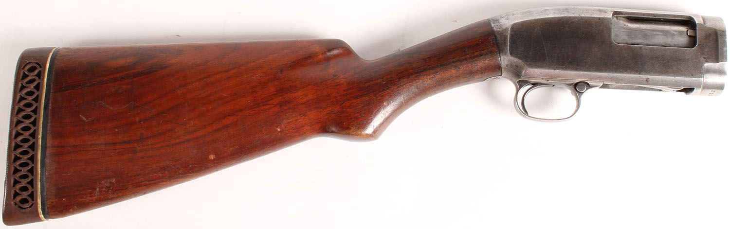 Winchester, Model 1912, 16 GA., MFG. 1919, SN: 219714, Pump action receiver & butt stock only, Early flat pistol grip stock is original, solid & in good condition, with nicks & dings, receiver has toned to a gun metal gray, stock carries a Pachmayr vent pad, LOP 14 1/8'' over pad, minor chipping at wrist, this rifle is being sold ''AS-IS'', with no returns. FFL or C&R Req. - Value: 50 to 150