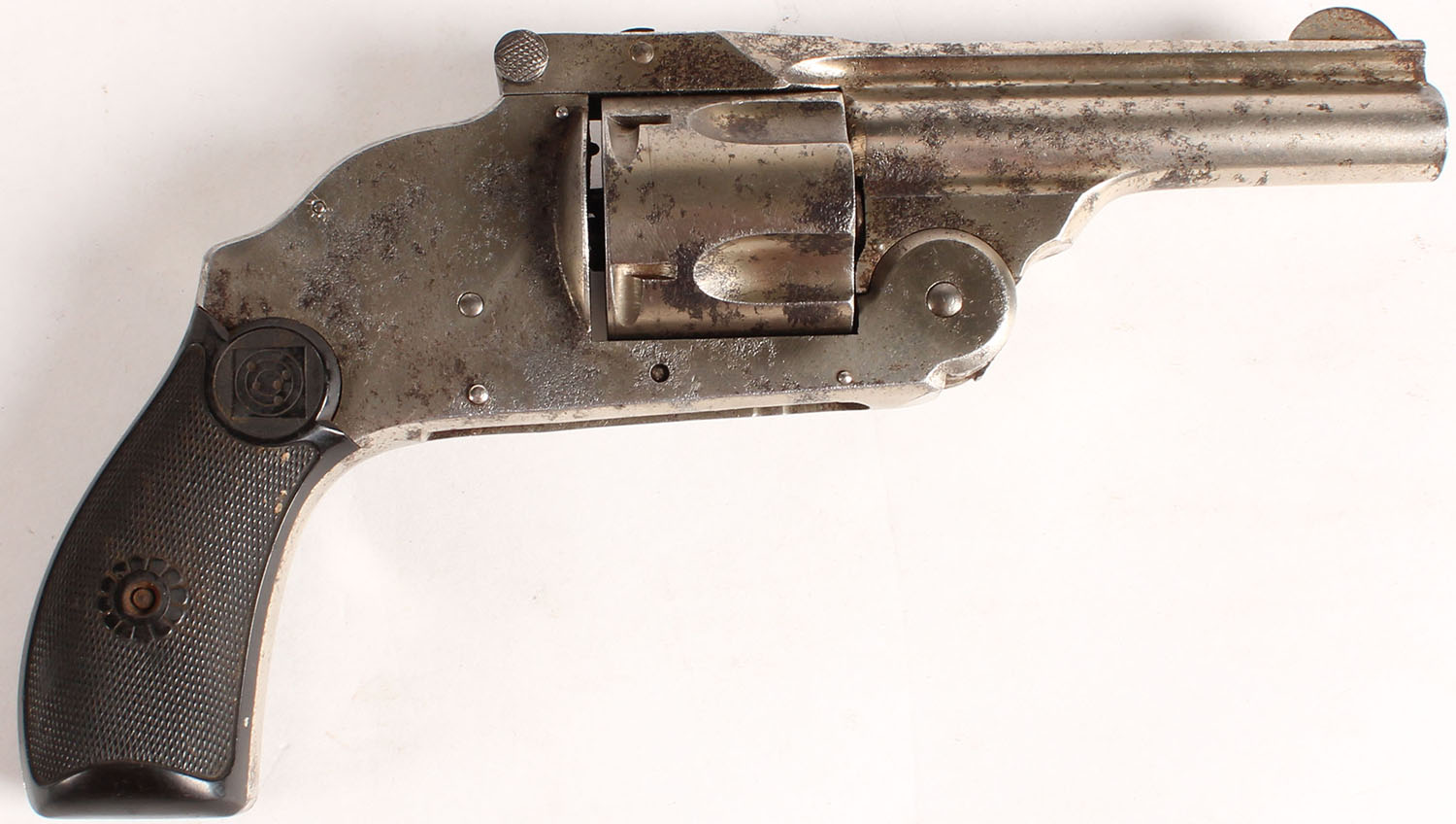 Harrington & Richardson, PARTS GUN, Model Hammerless 2nd Mod. L.F. Top Break, .38 Smith & Wesson, MFG: 1905-1941, SN:125953, O.A. Revolver, 3 1/14'' barrel, Missing trigger group & trigger guard. The plastic grips are very good & solid. Silver toned metal finish, with lots of rust pitting throughout. Cylinder spins, but does not index properly. Bore is poor. Being sold ''AS-IS'', with no returns. FFL or C&R Req. - Value: 10 to 100