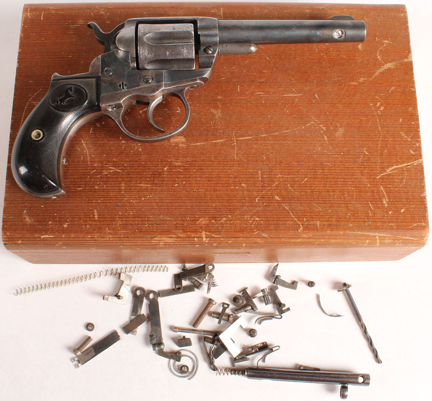 Colt, M1877 Lightning, PARTS/PROJECT PISTOL, .38 Long Colt, MFG: 1901, SN: 125879, Double action revolver, 4 1/2'' barrel. Hammer does not fully cock, trigger will not fully pull. Cylinder does not rotate. Checkered plastic grips have been worn smooth. Metal finish has worn gray, with some remains of blue. Some grinding marks on right side of receiver. Trigger & trigger guard have been worn to gray. Right side of barrel has a partial drilled hole 1'' from muzzle. Bore is poor, with very little rifling. Comes with lots small parts, some possibly spares. Comes in a wood box, with parts diagram & article on the workings of the Colt 1877. Being sold ''AS-IS'', with no returns. FFL or C&R Req. - Value: 50 to 200