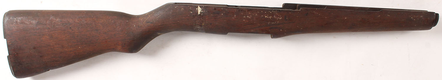 M1 Garand take-off wood rifle stock, no butt plate, dark oil finish. ''P'' stamp on bottom of wrist. ''A4'' stamped on left side of stock. Solid, with no cracks. Minor handling, dings & scratches. Needs to be cleaned, possibly sanded & re-stained. - Value: 20 to 80