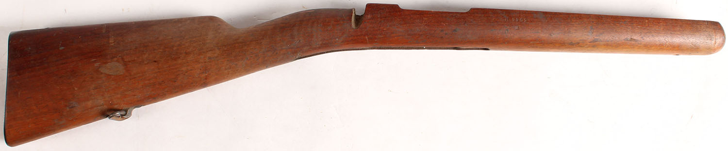 M1891 Argentine Mauser cutdown stock, Has five small cartouches on belly of stock, ''RA'' in circle, two ''AG'' in shields, a star, other faint stamping & a very faint remains of a cartouche on the right cheek that has a gouge where they tried to remove it. Original metal buttplate. Stock has rear sling swivel. Grade: Very Good - Value: 10 to 50