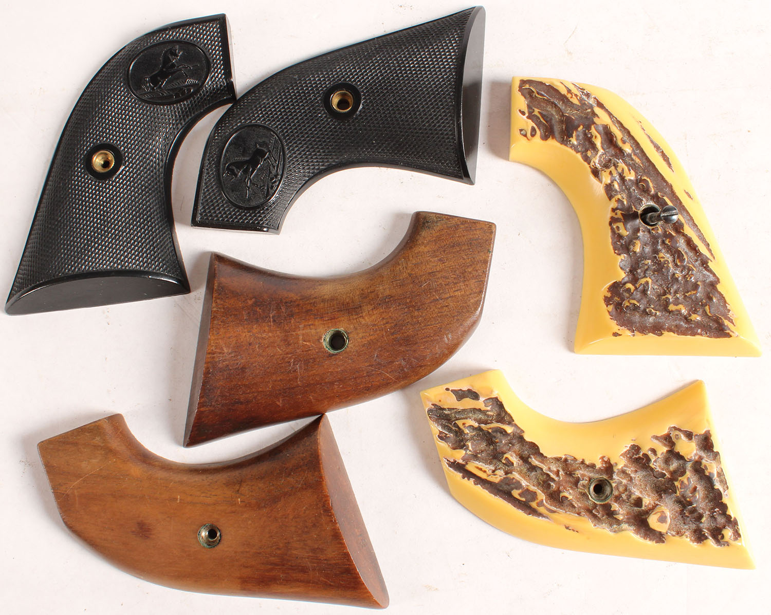 Lot of three sets of Colt SAA grips, one wood set, one hard rubber, & one Faux-stag. Grade: Excellent - Value: 30 to 90