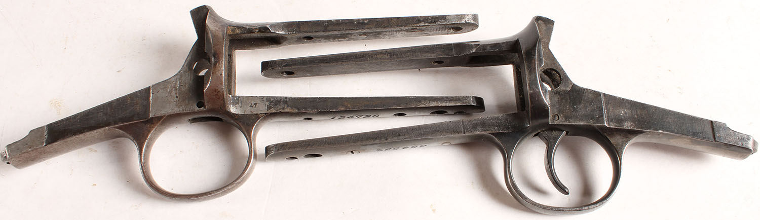 Winchester, lot of (2) Model 1890 back portion of receivers (trigger guards & tangs), Take-offs. SN: (354594) & (134720), One with trigger. Some polishing & wear. But no rust. SOLD ''AS-IS'', NO RETURNS. FFL or C&R Req. - Value: 20 to 100