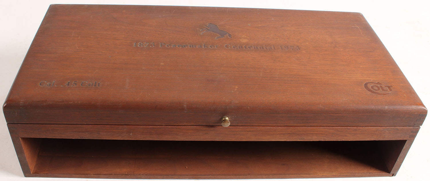 Colt, Centennial Peacemaker wood display box. Box is missing the main drawer which holds the revolver. Below lid, glass cover over drawer. Top has Rampant Colt, Colt logo & stamped ''1873 Peacemaker Centennial 1973'', ''Cal. .45 Colt''. Picture of Samuel Colt on underside of lid. Case is in excellent condition. - Value: 10 to 100