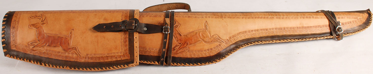 2 piece leather rifle scabbard, Beautiful intricate hand leather work. Leather edge sewn. Leather straps all present Case is solid & excellent. - Value: 20 to 150