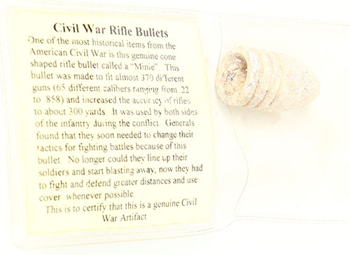 Civil war rifle bullets, from the american civil war is this genuine cone shaped rifle bullet called a ''minie''. This bullet was made to fit almost 370 different gun (65 different calibers ranging from .22 to .858) and increased the accuracy of rifles to about 300 yards. It was used by both sides of the infantry during the conflict. Generals found that they soon needed to change their tactics for fighting battles because of this bullet. No longer could they line up their soldiers and start blasting away, now they has to fight and defend greater distances and use cover whenever possible. This is to certify that this is a genuine Civil war artifact. Grade: Very Good - Value: 30 to 60
