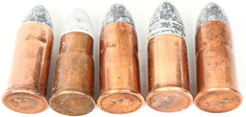 Lot of 5. Spencer Rifle Cartridges. (3) 56-50, HS:''SAW'' impressed, PT Lead. (1) 56-56, NHS, PT Lead. (1) 56-46, NHS, RN Lead. Grade: Very Good ++ - Value: 40 to 80