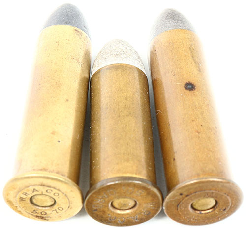 Lot of 3. (2) 50-70 Govt. 1-- HS:''W.R.A. Co. 50-70'', PT Lead. 1--HS:''R 89 W 3'', PT Lead. (1) 50 Carbine, HS:''W.R.A. Co. 50. CARB'', FN Lead. Grade: Very Good + - Value: 20 to 30