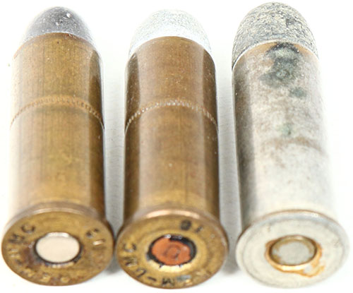 Lot of 3. .38 Colt. All U.S. Military Loadings. (1) HS:''F 94 3'', RN Lead, Tinned case. (2) HS:''REM-UMC 18'', RN Lead, Brass case, one has a nickel primer and the other a copper primer with imprinted ''U''. Grade: Excellent - Value: 2 to 20