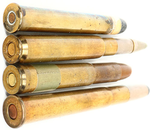 Lot of 4 British Sporting Cartridges. (1) .318 Westley Richards, HS:''WR 318'', PT CN LT capped. (1) 360x2.25'' Express, HS:''ELEY . 360 .'', RN PP Lead w/ copper tube. (1) 400/360 Nitro, HS:''KYNOCH NITRO 400/360'', RN CN SP. 400/375 Belted, HS:''HOLLAND'S .400/375 NITRO. Grade: Very Good + - Value: 20 to 40