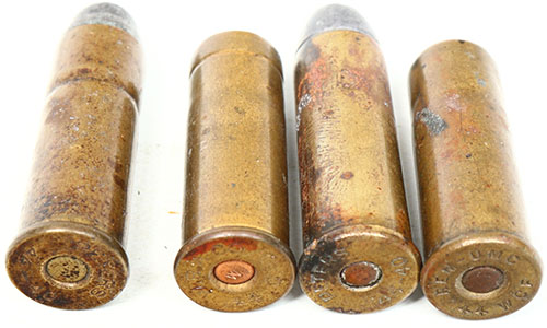 Lot of 4. 44-40 WCF. (2) HS:''PETERS 44-40''. FN Lead w/ copper primer & FN CN SP w/ flat brass primer. (1) HS:''W.R.A. Co. 44 G G'', Rnd Ball, copper primer w/ ''w''., . (1) HS:''REM-UMC 44 WCF'', Rnd Ball and a copper primer. Grade: Excellent - Value: 10 to 20