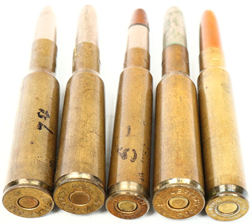 Lot of 5. (3) .333 Jeffery Nitro= HS:''JEFFERY .333 K'', CN jacketed--1 ea of FMJ, SN w/ slits and ''solder point. (2) .318 Westley Richards Nitro=(1) HS:''KYNOCH 318 NITRO'', RN CJ FMJ. (1) HS:''KYNOCH .318'', RN CN base with CJ cap. Grade: Very Good ++ - Value: 20 to 40