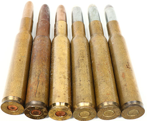 lot of 6. .30-03 Springfield. (3) Military contract loadings by Winchester. HS:''FA 2 06, FA 4 06, FA 5 06'', RN CN FMJ. (3) commercial cartridges w/ military headstamps. HS:''W.R.A. Co. 05 .30 G. 03 10'', ''W.R.A. Co. 5 06'', All commercial cartridges have RN CN SP. Grade: Excellent - Value: 6 to 15