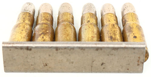 Lot of 6. 5mm Clement Pistol. HS:''H * K&C *''. RN CN FMJ. Also includes the flat steel charger. Grade: Very Good ++ - Value: 80 to 160