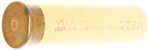 J.P. & S. V No 4, empty, 4 ga. paper signal flare by Eley, 4'' OAL, solid shell. Grade: Excellent + - Value: 10 to 50