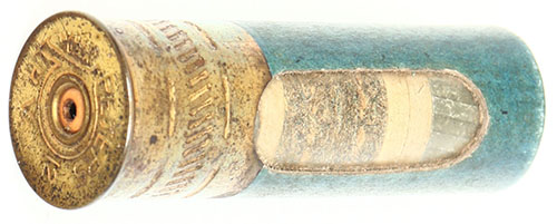 H/S= ''Peters Made in USA 12 H.V.'', 2 1/2'' OAL, window shell, with slug load, salesman sample in green paper case. Grade: Very Good ++ - Value: 20 to 100