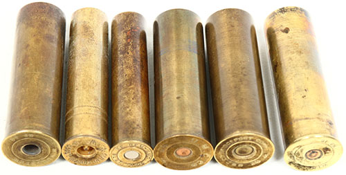 | Lot of 6, various manufacturers, 14, 16, 28, 32 ga., empty brass...