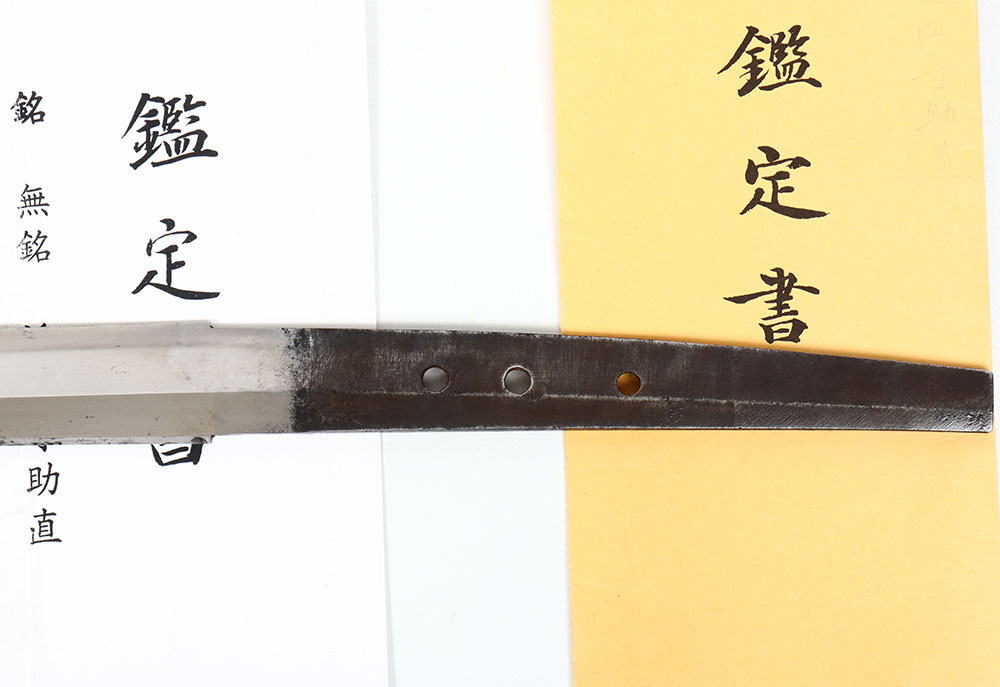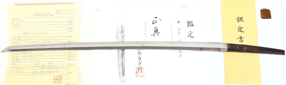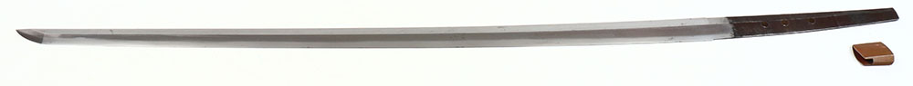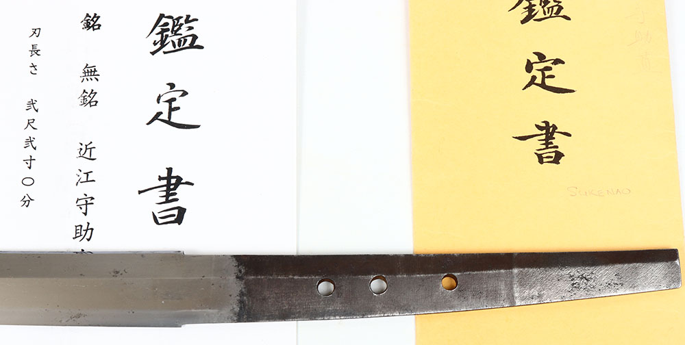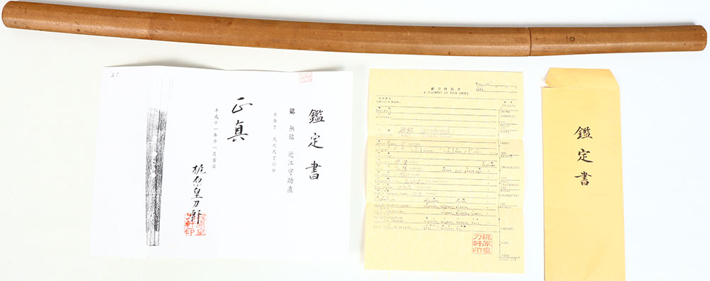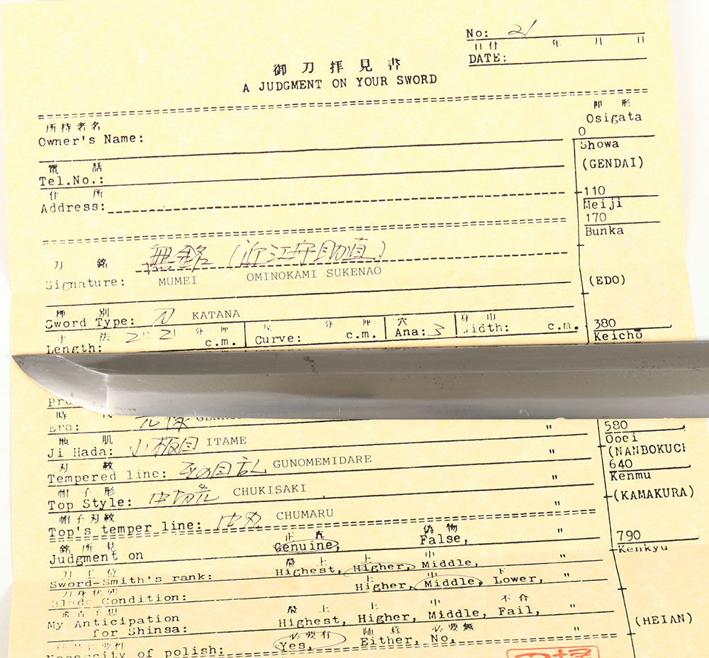 Exceptional Antique Japanese Katana. 38 3/8'' overall and 26 1/2'' cutting edge. Mounted in Shira-saya - a storage sheath, made from Japanese Magnolia wood. There are indications that this is a Tachi - ''great sword or long sword'' that has been cut down to Katana size over the years. This blade has been brought to Shinsa - a committee of Japanese sword experts that judges and completes paperwork on the sword, providing provenance showing the following: Blade is not signed, however the swordsmith is attributed to Ominokami Sukenao a higher ranking swordsmith who made this blade over 300 years ago. It was made in the Setsu province and displays a Gunomemidare temper line. Also included is an Oshigata - a rubbing of the blade's tang. There are 3 Mekugi-ana - the holes in tang for bamboo peg that holds the handle to the blade, which is one of the indicators of the age of blade and in this case that this sword has been cut down at least 2 times. Variations in the file markings in the Nakago - tang, also contribute to this conclusion. This blade has very fine forging grain in the steel and a straighter temper, along with fine Nie and Nioi - the crystallization within the metal along the edge of the Hamon - temper line, typically visible only on higher quality Japanese swords and that run along the edge of the Hamon which has the subtle Gunomemidare - along with irregular or ragged activity within. Copper one piece Habaki - a metal collar around the blade above the tang that holds the blade securely in the scabbard. Polisher's marks under Habaki and at the Kissaki - tip of the blade, are marks of a higher grade temper and polish on the blade. There are some very, very small chips at the tip of blade and along the cutting edge about 10'' from the tip, possibly from use in battle or duels, that would easily polish out. A very nice old blade made in the 1600-1700's with paperwork that is in itself difficult to acquire. This quality of Japanese swords are getting more and more difficult to obtain as many reside in museums and collections around the world. If you would like to preview these you will need to make an appointment before hand. - Value: 8000 to 12000