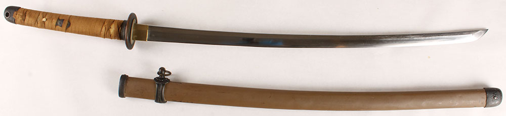 Japanese, WW2 era Type 44 Shin-Gunto, 26'' machine made blade, the blade has no visible nicks or dings on the edge, blade also only has light scratches with no rust or patina. Blade has no fuller. Brass Habaki with a copper guard. wood handle with ray skin leather grips, wrapped in cloth. Sword comes with a metal , one point scabbard that has tan paint. Grade: Excellent - Value: 400 to 800