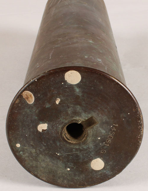 Military shell, not marked, 3 inch shell. OAL: 12 5/8''. Grade: Good + - Value: 10 to 100