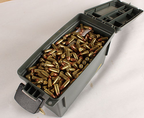 Plastic .30 cal ammo can, filled with approx 1000 Rds. Of 9x19mm, ammo is Mix MFG H/S & appear to be reloads. Ammo is excellent. Grade: Excellent - Value: 300 to 900