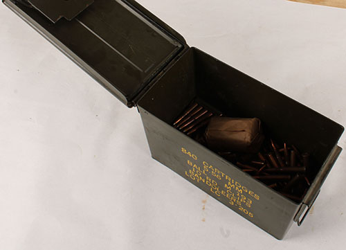 M2A1, .50 cal ammo can filled with approx 100-150 Rds. Of 7.62x54mmR, ammo is corrosive, ammo is very good. Grade: Very Good + - Value: 40 to 150