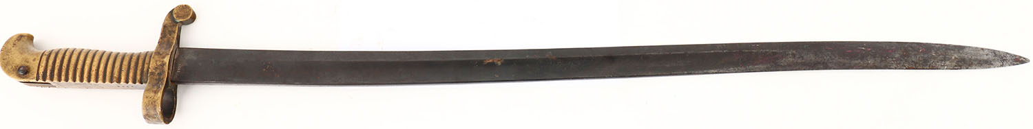 RARE!!, US, 1861 Merrill Navy Rifle, Yatagan sword bayonet. Blade has areas of brown & dark brown patina. The right side of the blade is marked ''1861'', the top of the grip is marked ''3308''. The brass handle has wear & patina. Grade: Very Good + - Value: 200 to 600