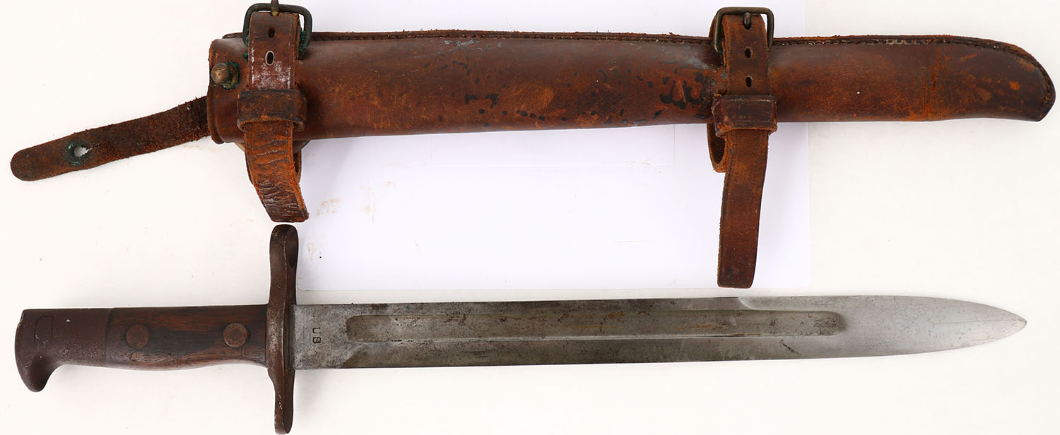 US, M1892 Krag Bayonet, with a M1912 picket pin Scabbard. The blade has a few small spots of patina bit is in overall very good condition. The guard & pommel have toned to a brown patina. The left side of the blade is marked ''1898'', the right side of the blade is marked ''US''. The scabbard has wear, scuffs, & the leather is cracking in spots due to age, but is still in very good condition. The M1892 bayonet was based of the Swiss M1889 Bayonet, & production of the bayonet ran from 1894 to 1903. the M1912 picket pin scabbard was not designed for the Krag bayonet & was first made way after production of the Krag bayonet ceased. It was meant for the M1912 picket pin, which meant for the cavalry & was a multi-tool of sorts. It could be driven into the ground to tether the cavalryman's horse, also it has a claw hammer head & could be used to make emergency repairs to saddle, tack, or horseshoes. Grade: Excellent - Value: 100 to 300