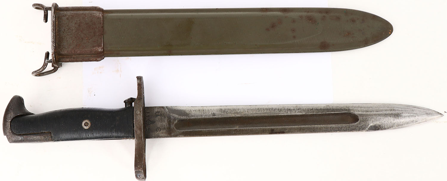 US, Utica Cutlery Co., M1 Bayonet & sheath. The blade retains about 50% of its finish with wear & thinning from use, there is light pitting inside the fuller of the blade. The guard retains almost full finish coverage with spots starting to tone brown, & the pommel retains almost full finish coverage with light wear. The black plastic grips have light scuffs/wear from use. The left side of the blade is marked ''U. C.'', ''U'' flaming bomb ''S''. The metal parts of the sheath has light rust & patina, & is marked ''U.S'' in a flaming bomb. Grade: Excellent - Value: 100 to 250