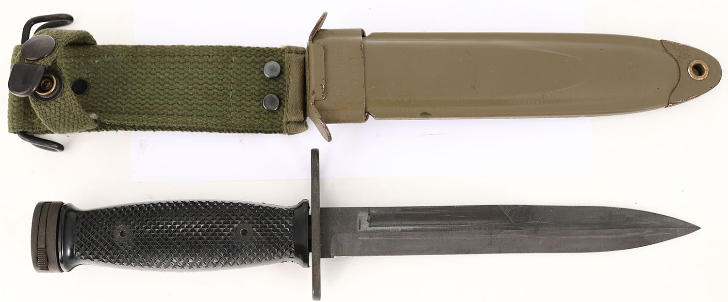 US, Turner Manufacturing Co., M4 bayonet & sheath. The blade retains almost full finish coverage with sheath wear & scratches from use. The guard & pommel retain about full finish coverage. The black plastic grip has only light use wear. The top of the guard is marked U.S.M4'', ''TMN''. The whole sheath has been painted over. The sheath is marked ''U.S.M8A1'', ''V.P.CO''. This is a second contract M4 bayonet. They would be made from the mid 50's, until the 70's. the second contract fixed the few durability problems with the guard & locking lug. The leather grips were replaced with plastic grips, making manufacturing & repairing them cheaper & faster. Grade: Excellent + - Value: 100 to 200