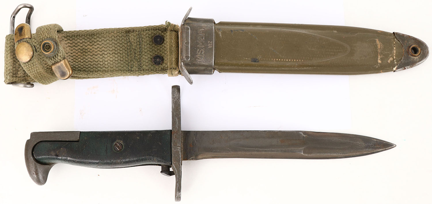 US, South Korean modified, M1 Bayonet (M5). The blade retains almost full finish cover with spots of thinning & light rust forming. The guard & pommel also retain about full finish coverage with spots of wear. The black plastic grip has scuffs & light chips. There are no visible markings on the guard. There is a faint ''A'' hand etched into the right side of the blade. The sheath has scuffs, scratches, chips, & wear from use. The sheath is marked ''U.S.M8A1'', ''VIZ''. During the Korean war, the south Korean forces received many weapons & supplies from the US, this included M1 Garands & the M1 bayonets. The Korean forces being shorter in stature did not like the longer blade profile of the M1 bayonets & much preferred the shorter & slimmer, M4 Bayonets. Many M1 bayonets would be modified & have their blade profiles cut down & shaped after the M4 Bayonet. The Korean designation for the modified bayonets would be M5. Grade: Very Good ++ - Value: 50 to 100