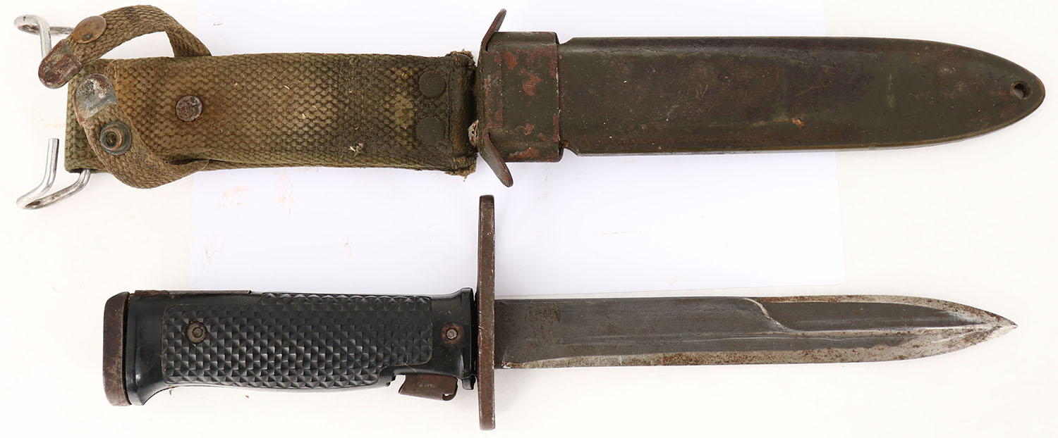 US, Columbus Milpar & Manufacturing Co., M6 Bayonet & sheath. The blade retains most of its finish with areas of wear & brown patina forming. The guard & pommel are starting to tone to a brown patina. The top of the guard is marked ''U.S.M6'', ''MILPAR COL.''. The sheath has a green pain that was added all over it. The paint is worn away in spots to reveal rust underneath. The sheath has no visible markings. The M6 bayonet was designed to fit the M14 rifle. The army took the design of the M5 bayonet, added a muzzle ring instead of the gas plug stud, added a different lug catch to the rifle, & came up with the M6. the floating bayonet catch is very interesting. It was done to avoid changes in center of impact, & reduce shot dispersion during full-auto fire with bayonet fixed. This same design was on the T48 (FAL) bayonet, which the military was testing at the same time, & the army liked the idea. Basically the bayonet lug catch was under spring tension, allowing the bayonet to move forward (stay in place) when fired about 1/10 of a inch while the rifle recoiled backwards, then the spring return the bayonet to its original position. This same latch would be adapted to the M5 bayonet, making the M5A1. Grade: Very Good + - Value: 80 to 160