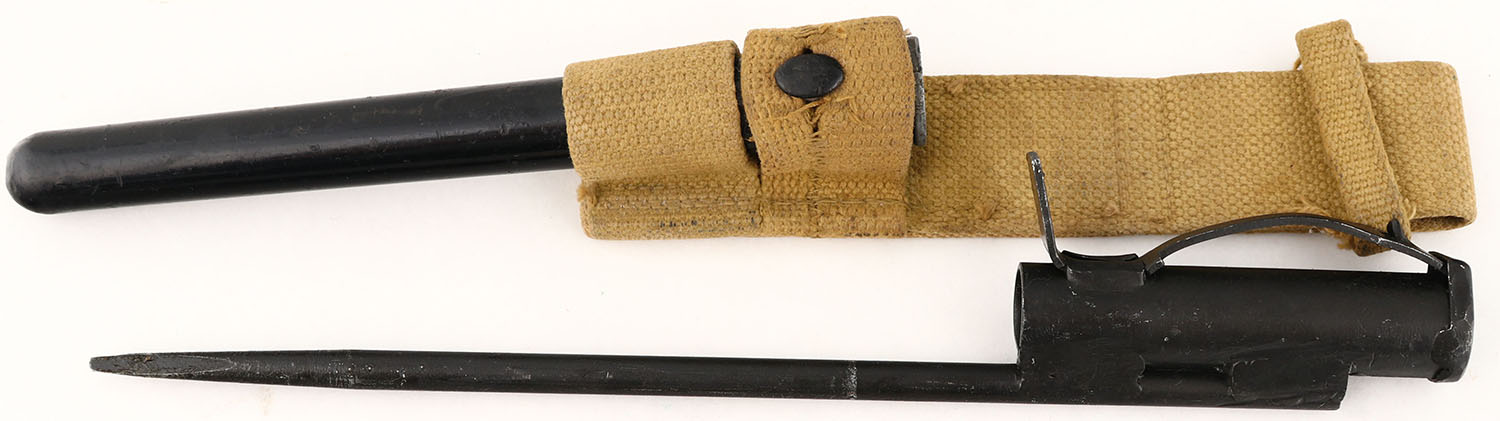 RARE!!, British, Sten Mk.1 Bayonet, with sheath & frog. The blade has only a few spots of finish thinning. There are no visible markings on the bayonet. The sheath has spots of paint chipping/thinning. This very crude bayonet was designed for the Sten Mk.2 submachine gun. The blade design was copied from the No.4 Mk.3 bayonet & utilized the same sheath. Around 75,000 were made with nearly all the bayonets believed to have been scrapped making surviving examples scarce. Grade: Excellent ++ - Value: 100 to 300