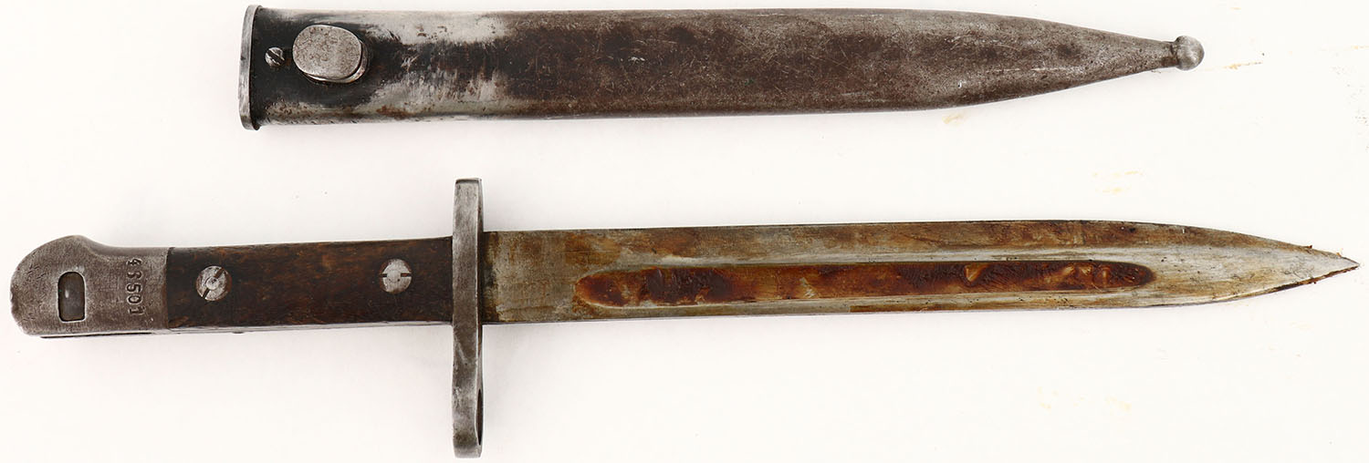 Turkish, Askari Fabrika, M1935 bayonet & sheath. The blade is bare metal & is covered in old grease. The guard & pommel have toned to a brown patina. The wood grips have small dings & wear. The right side of the pommel is marked ''AS.FA'', the left side is marked ''45501''. The sheath has finish wear, scratches & parts toning to a brown patina. This is the final Turkish bayonet type designed for use with Mauser rifles. This example is of new manufacture. However, the M1935 designation is also applied more broadly to a bewildering variety of similarly-dimensioned bayonets cobbled together using recycled parts from older bayonets. Grade: Very Good ++ - Value: 30 to 90
